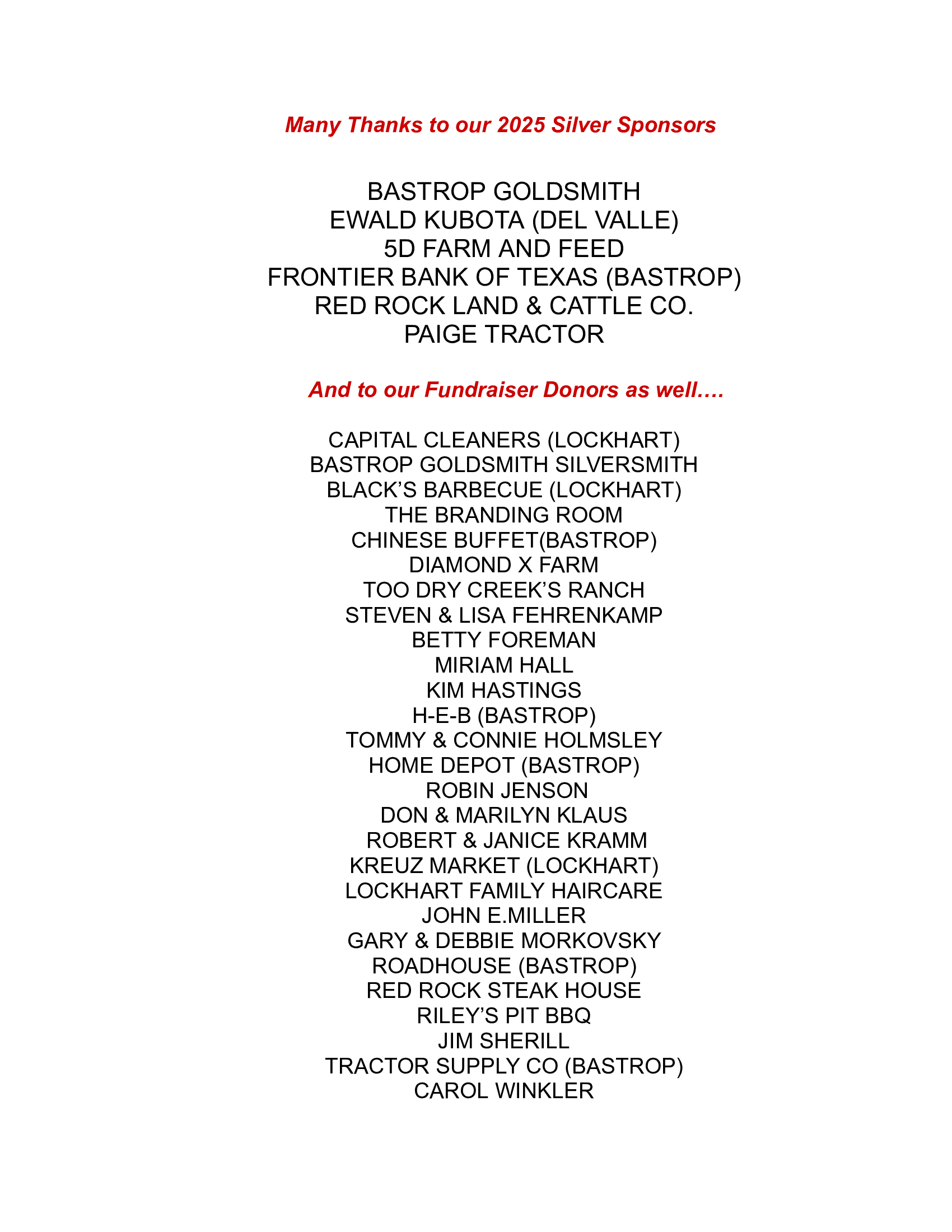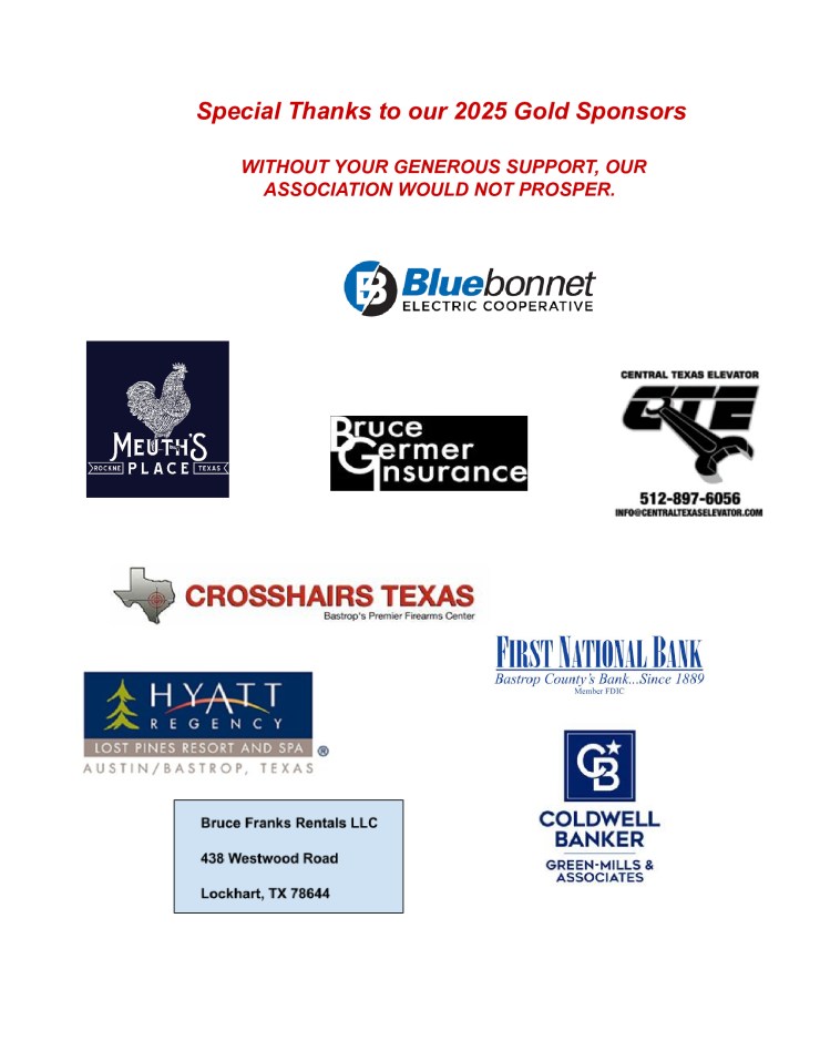 SPONSORS 2025 PAIGE TRACTOR CROSSHAIRS FRONTIER BANK FIRST NATIONAL BANK BLUEBONNET HYATT REGENCY LOST PINES COLDWELL BANKER MEUTH’S PLACE EWALD KUBOTA BASTROP GOLDSMITH SIVLERSMITH AND FIREWORKS BRUCE GERMER INSURANCE 5D FARM AND FEED Like Loading...
